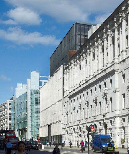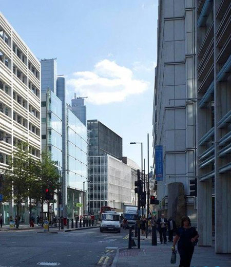 面積為1.9萬平方米的大樓坐落在Moorgate和South Place交叉口的Fiury環形保護區內。該事務所主管Paul Sandilands表示,這座建筑從垂直和水平方向都不會對Britaic屋造成影響,同時建立起一種視覺聯系,活躍了Fiury環形區的街景。