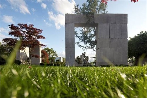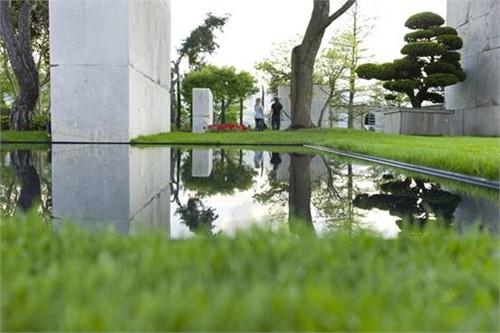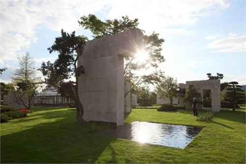 景觀建筑師將當地的砂巖通過框架固定,形成了形狀各異的墻。在這砂巖背景墻下看樹,這些大多數來自東方的樹似乎也具有了東方的禪意。