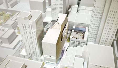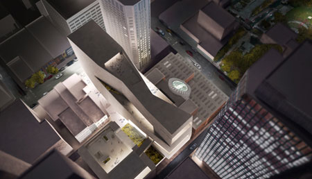 5月份已經公布的初步設計顯示出一個楔形的建筑,坐落在原先的5層樓上方,高度為50英尺。一條18英尺寬的步道引向新附樓的入口。為了給擴建工程騰出空間,一座消防站被拆除,并打算在附近街道重建。