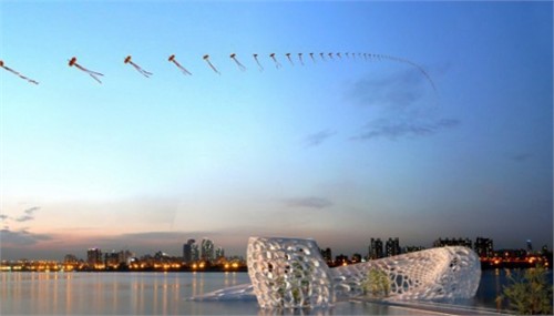 這是一個暫未實施的設計項目,位于韓國首爾,項目名稱為“水舞館”,它有著非常優雅的建筑形態,好似一條美人魚歇息在水面之上。外觀設計采用了水波紋的元素,當陽光透射時,建筑室內室外的墻面都能呈現波光粼粼的效果。舞水館是為公眾休息空間,空間的運用是靈活的,可以舉辦演唱會,展覽等活動。