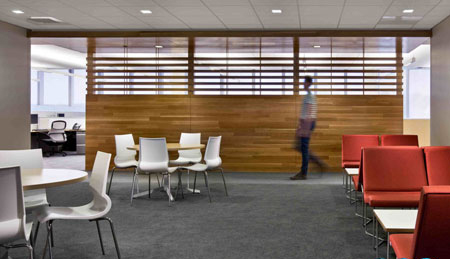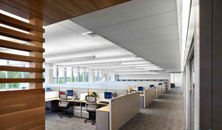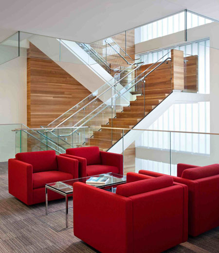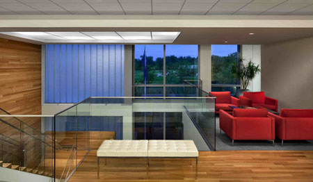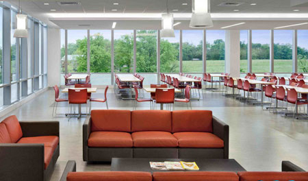 這座建筑有著充足的自然光照和大塊的觀景視野,如同在愛爾蘭時(shí)一樣,與戶外空間有著強(qiáng)烈和連續(xù)的視覺聯(lián)系。內(nèi)部空間的布置反映出公司的雙重文化:歐洲風(fēng)格的辦公室更為開放,而美式風(fēng)格的辦公室則更為私密。一般美國公司每個(gè)員工的工位有200到250平方英尺,但Almac的辦公空間是每個(gè)人165平方英尺,更傾向于歐洲風(fēng)格的工位布局。