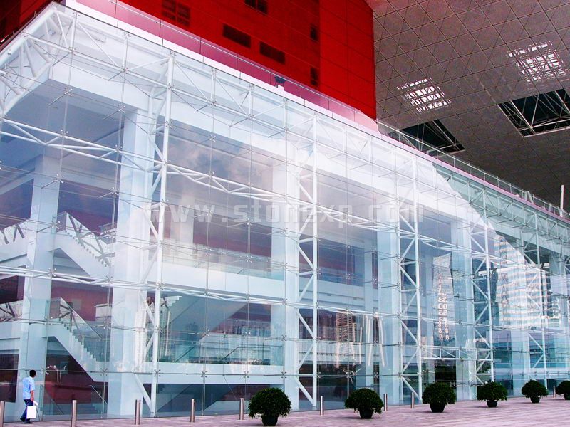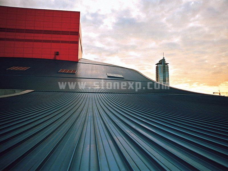 本工程采用人工挖孔樁,主體為大框架剪力墻和鋼結構相結合的鋼混結構,方塔5至7層設結構轉換層,為鋼桁架結構,每榀高14.38m,凈跨34.2m,重達260噸。 大屋頂總面積6萬平方米,呈三維空間曲面形狀,總長度486米,最大寬度154米,厚度由2.25米至9米,以樹狀支撐于東西區建筑屋頂136個支座上及兩個塔樓12個巨型鋼牛腿支承點上。