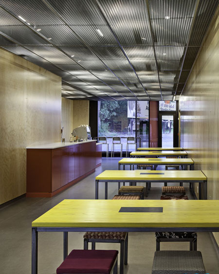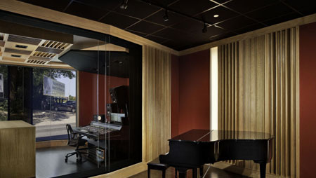 除此之外,音樂(lè)工作室還需要有透明性,為此安裝了大塊的落地玻璃窗,形成內(nèi)外部的視覺(jué)聯(lián)系。這座建筑有三層,面積為1.92萬(wàn)平方英尺。SubCat占據(jù)了地下室和頭兩層。第三層是為來(lái)訪的藝術(shù)家準(zhǔn)備的住房。這里將配備1萬(wàn)平方英尺的錄音室,并可繼續(xù)擴(kuò)張后用于商業(yè)錄音、圖文設(shè)計(jì)和教育培訓(xùn)等功能。