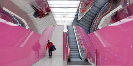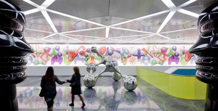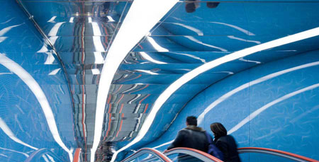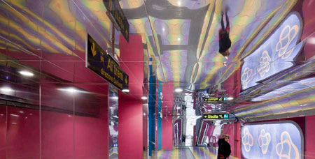從廣場進入地鐵站,人們將走過一個覆蓋了陶瓦的內部空間,每塊陶瓦都刻有一個上世紀產生的新詞匯。空間的色彩和圖案十分引人注目,而大廳透鏡般的圖像不斷變換顏色,看上去十分富有趣味性。抽象的SYOSIS雕塑模擬了大腦中的節點和突起。
