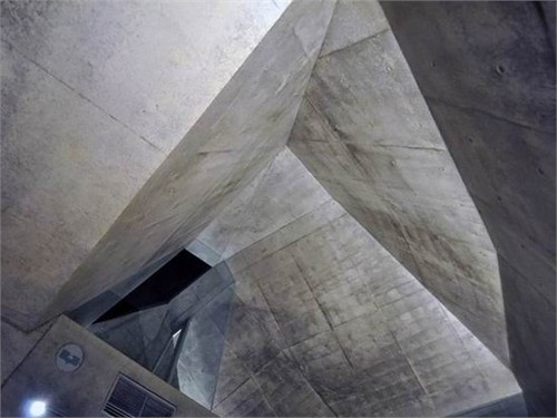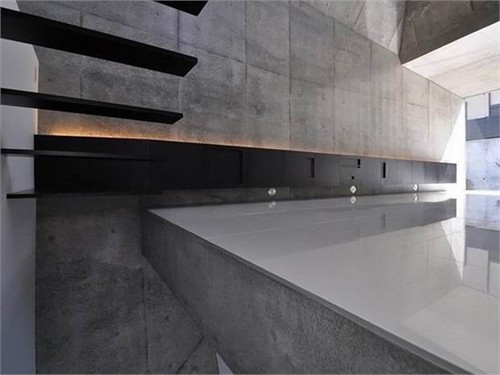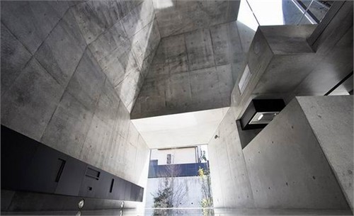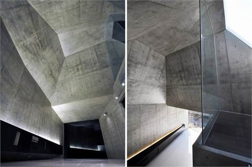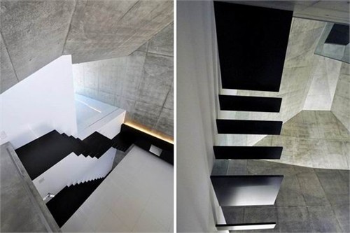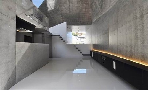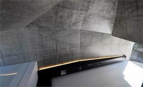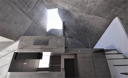 主要的起居室被布置在二層吹拔空間中。外部豐富的多面形式被延續到了室內,形成了一個復雜而多角度的屋頂效果。盡管建筑師選用了相對沉悶的混凝土飾面材料,但豐富的室內屋頂形式和多重焦點在垂直方向上拓展了空間深度,創造了一個格外開放而空曠的起居空間。突出的天窗,巨大的落地方窗以及光滑的白色地面都盡可能的為室內提供豐富的自然光線。