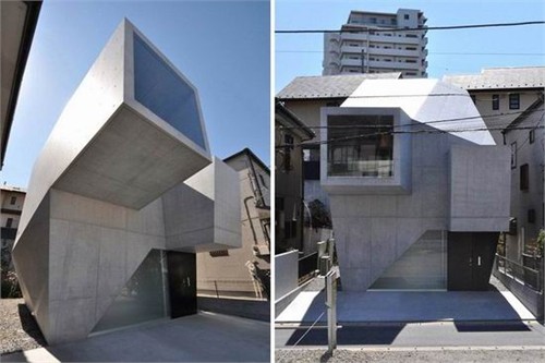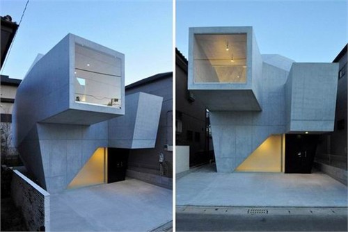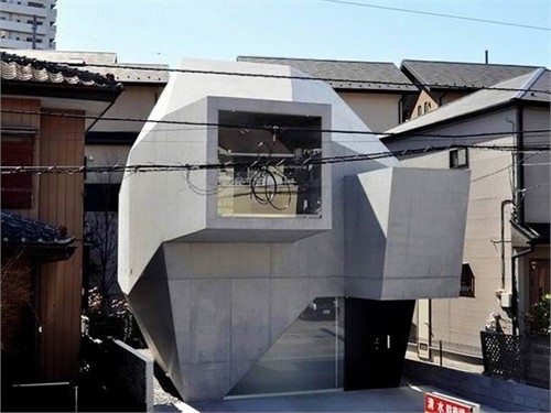基地兩側被緊鄰的建筑包圍,這座住宅是由鋼筋混凝土建造的,形態有機多變,產生了許多斜面。兩個混凝土體量從臨街立面上突出,懸在入口和停車位上方。建筑師在兩個懸挑前方設計了巨大的落地窗,讓室內能接受到充足的自然光線。