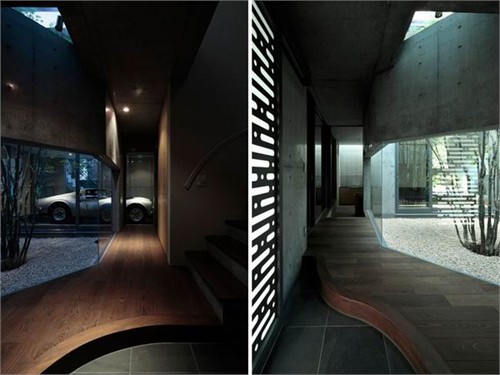 (左)從入口能看到車庫中的汽車;(右)從入口到庭院的走廊