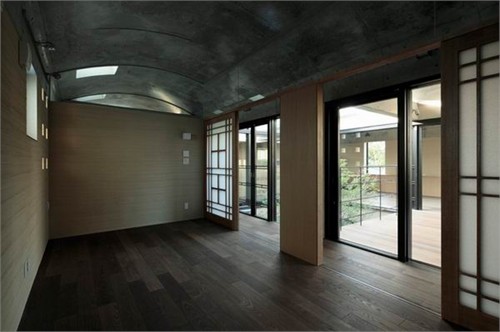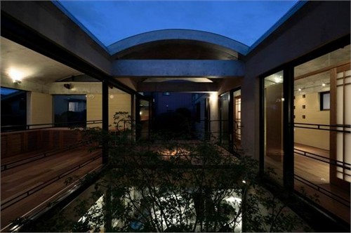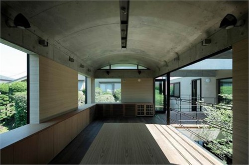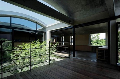 住宅二層包含了很多主要功能空間,包括餐廳、起居室、廚房以及主臥和兒童房。U形的平面圍繞一個中心庭院布置,庭院成為室內主要采光源。被透明玻璃包圍的庭院與室內空間完全的融合。另外,建筑師還設計了三個拱頂,創造了連續而富有節奏感的設計語匯。