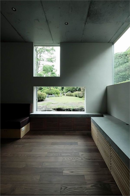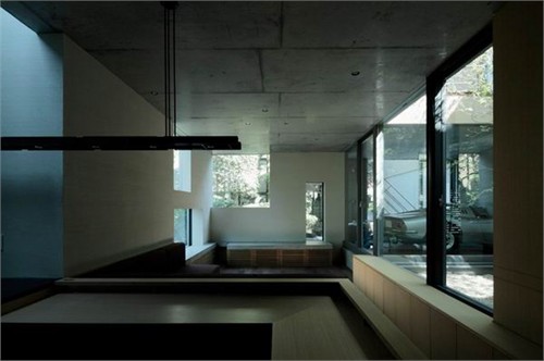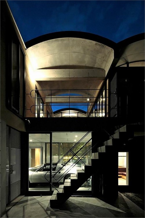 三個車庫門占據了整個臨街立面。單車車庫一直深入到住宅室內布局之中。另外一個能容納兩輛車的大車庫被安排在住宅的南側,可以很便捷的駛入車道。建筑部分選用了玻璃材料,居住者可以直接看到小車庫中的汽車同時這些車庫也成為首層起居室的視覺焦點。