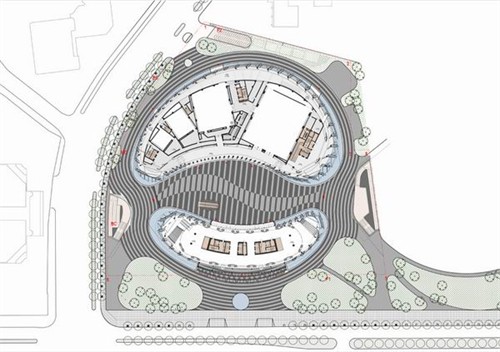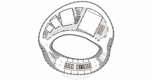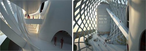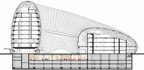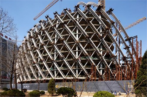 這個項(xiàng)目是由中國建筑師邵偉平和北京建筑設(shè)計(jì)研究院方案創(chuàng)作工作室設(shè)計(jì)的。這個綜合性的項(xiàng)目將包含電視演播廳,辦公和商務(wù)等多種功能。曲線的殼體形態(tài)來源于莫比烏斯環(huán)概念,這條沒有開頭和結(jié)尾的環(huán)將宏偉的中庭空間纏繞包裹。巨大的鋼鐵斜肋構(gòu)架支撐著大面積玻璃幕墻,透明的玻璃表皮微室內(nèi)帶入充足的光照。中庭最高處達(dá)到30米,形成了煙囪效應(yīng)使室內(nèi)空氣自然流通。