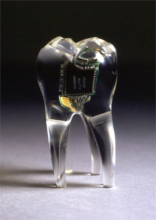 收音牙齒植入技術是有關個人信息溝通的一種激進的新觀念。這項技術關鍵是利用了人體骨骼的導音性。在普通的牙科手術中,醫(yī)生可以將一個微型的收音和播音芯片植入牙齒。近距離磁效應會激活接收裝置上休眠的芯片,傳感器將這種聲音信號轉化為微振動,通過下頜骨傳到內耳。
