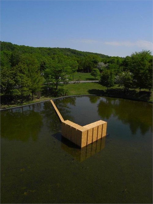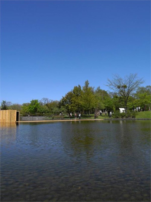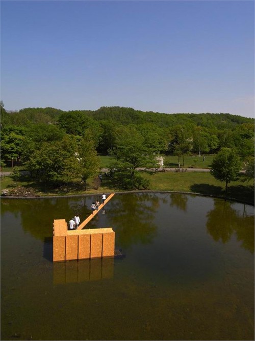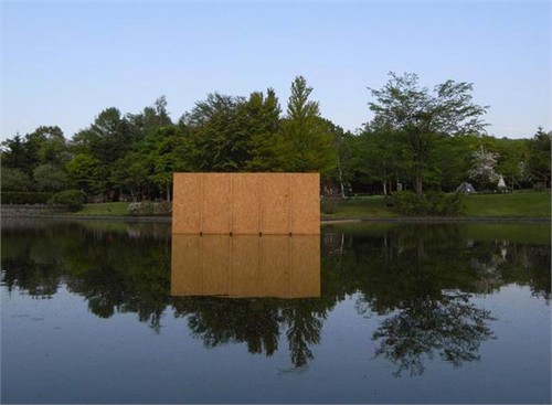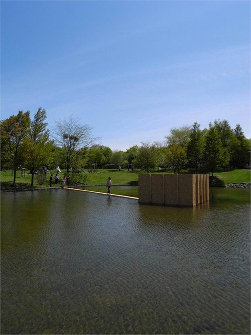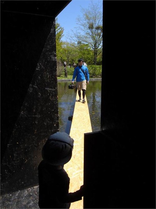 由日本建筑師山田良(ryo yamada)設(shè)計的“無限景觀”裝置位于日本札幌當(dāng)代藝術(shù)博物館的中心湖面上。參觀者必須要通過一條細(xì)長的小木橋才能從陸地到達(dá)湖中心的建筑裝置中。這個方盒子被O導(dǎo)向展板包圍。一旦進(jìn)入封閉的盒子中,墻壁和屋頂都是黑的,一絲光線都無法進(jìn)入,同時這個全黑的環(huán)境還讓參觀者喪失了方向感和時間感。