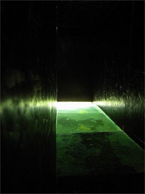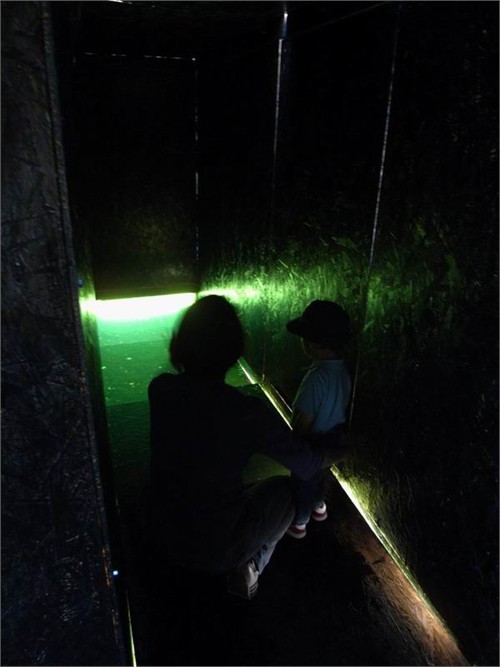 在木板隔墻和地面之間留有一道狹窄的縫隙,綠色的光線會透過縫隙微微照亮這個黑暗的空間。陽光在的湖面上反射出光線,并滲透到這個全黑的方盒子內(nèi)部。迷失在其中的參觀者只能依靠最基本的感受來活動,并對我們身邊的世界有了更深層次的體驗。