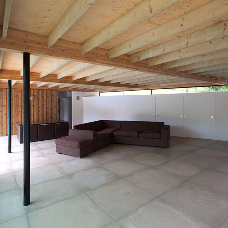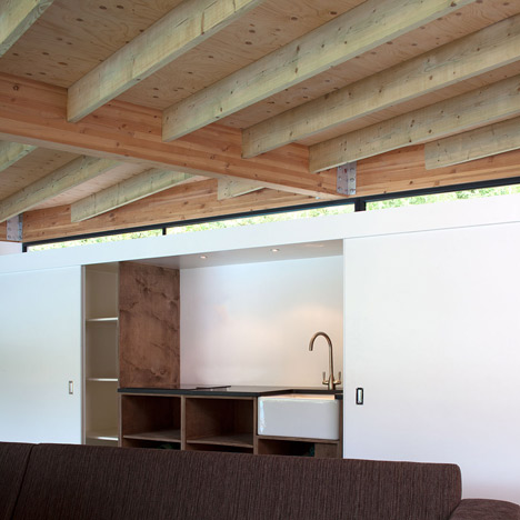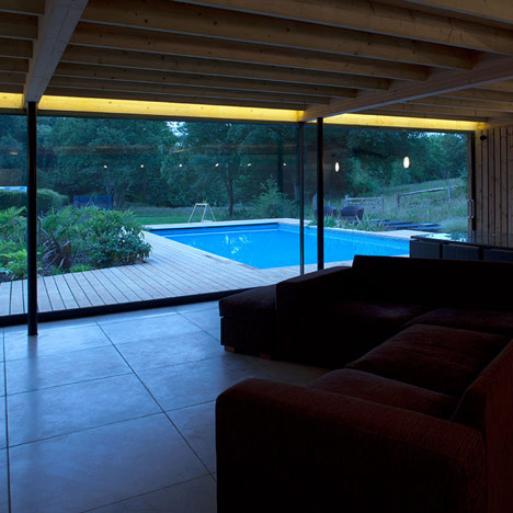 新式泳池住宅依傍著大地朝向老農舍的南方,取代了單層農舍建筑群落。這座住宅有著驚人的覆蓋區,使一邊的車庫和另一邊的光亮的書房與花園邊緣相映成景,其中的空間可做多用途使用。三間屋子被兩片鰭狀物隔開,膠合層木的鰭廊將中間這部分大空間隔開。整面玻璃墻推拉門使得草坪,泳池,下至花園,農舍都能從一邊盡收眼底。
