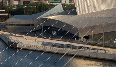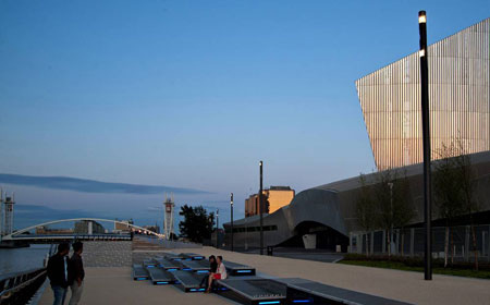 FoRM事務所設計的碼頭地帶富有凹面和凸面的幾何形狀,形成很有想象力的公共空間,是對北部皇家戰爭博物館和媒體城步行橋的一個補充。更重要的是,戰爭博物館在水岸邊新建了一個入口后,碼頭地帶將成為一半觀眾進入博物館的通道。原先沿著曼切斯特船運運河被阻隔的道路現在用新建的碼頭和臺階連接起來,并設置了寬大的步行和自行車道以及可供博物館使用的非正式表演和交通空間等。露臺式的坐席區延伸到水邊,能夠一覽河岸風景。無論是白天還是夜晚,這里都成為人們喜愛的觀光景點。