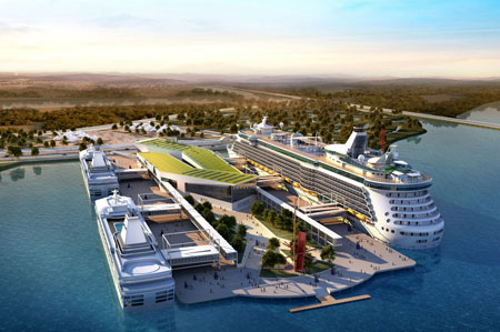 在競賽中,關鍵的因素是要將國際輪船碼頭的設計趨勢與當地條件結合起來。AECOM公司作為交通方面的顧問公司,決定建造可容納世界上最大游輪的碼頭(360米),并且在碼頭的另一邊設置靈活的停靠站點。兩條狹長的碼頭可同時停放兩艘國內游輪和一艘國際游輪。碼頭與現有的一座防波堤平行,讓船只可以方便地出入停泊點。碼頭建筑有兩層,既可以登船又可以讓乘客下船,減少了等待的時間。