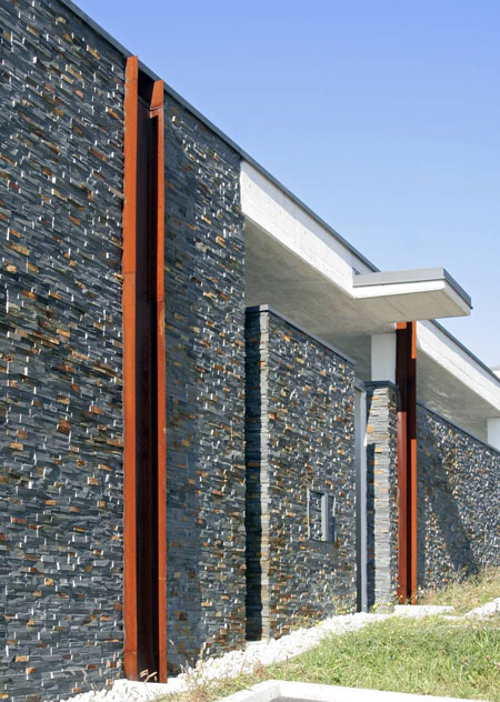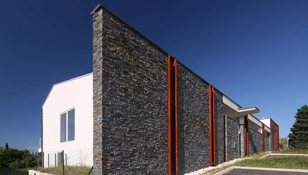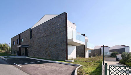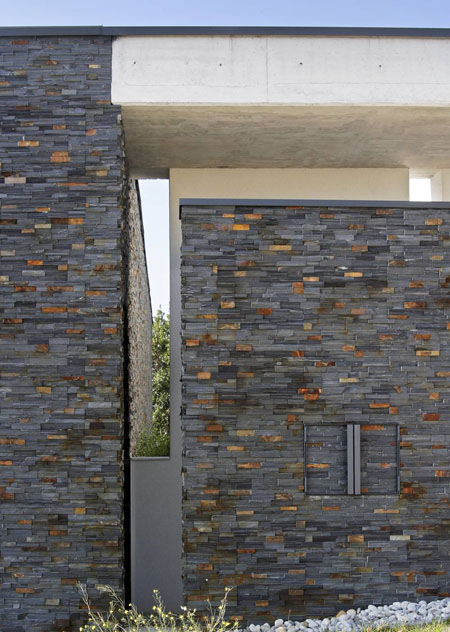 朝向街道的立面很像是堡壘,保護(hù)了住房的私密性。統(tǒng)一的石質(zhì)覆面將各個單元聯(lián)合起來,有了整體性,只是以一些小的開口讓人們一瞥庭院的情景。當(dāng)然,住戶也可以從這些開口看到海灣。以極簡主義為特征的設(shè)計手法和現(xiàn)代化的建筑語言使得這座房屋與周圍地中海的自然景觀和諧共處。