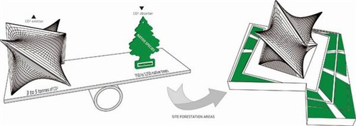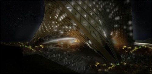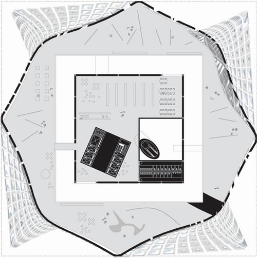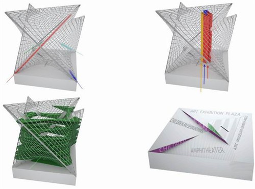 博物館的畫廊被安排在一個連續的邊緣坡道上,這一空間圍繞著藝術資源中心螺旋向上。行政管理區則位于建筑的最頂層,而兒童博物館位于建筑底層。在內部布局交叉的地點,一系列連續的金屬板從一個角落延伸到另一個,支撐了整個外部結構。外表皮包裹在主要的承重柱子上,形成了一個雙曲線形的玻璃立面結構,這種表皮結構可以幫助收集雨水、放置太陽能光電板并安裝活動窗以促進室內通風。建筑周圍的園林區域內種植了超過750~1250棵樹木以吸收各種設施排放的二氧化碳廢氣。