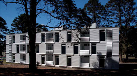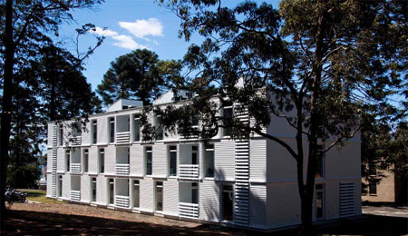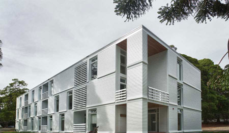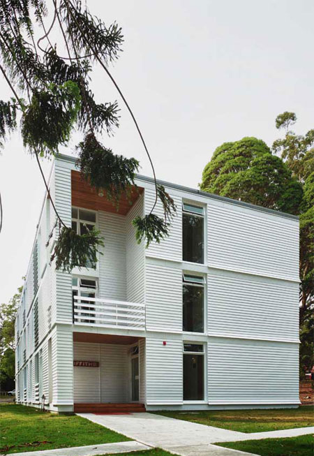 由于1970年代建造的三層磚石建筑與原有的優雅木質和陶瓦建筑不太協調,BVN事務所對其進行了改造,賦予自身的建筑語言,并沿用了白色護墻板和垂直分布的窗戶以微微彎曲的木質裝飾條。內部空間采用高性能的環保裝置,不需要機械通風便可營造舒適的起居空間。磚石薄片成為建筑的隔熱板,并以磚砌的內層墻面來承重,輕型的通風護墻板則作為外層墻面。走廊上設置了天窗,將自然光線和交叉通風帶入了公共空間。