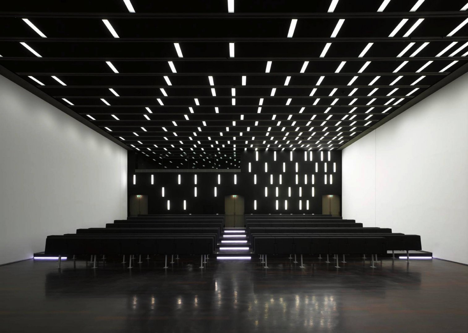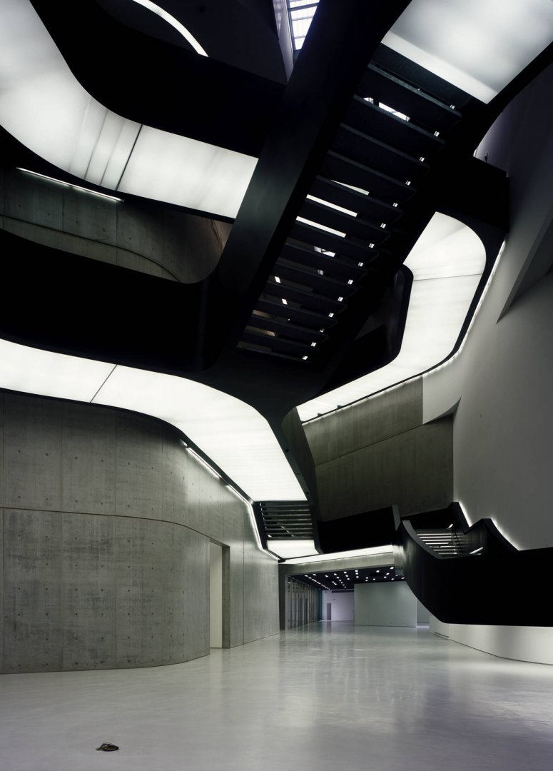 這次開放活動中,人們可以感受到純粹而空曠的建筑空間,因為隨后藝術品會在冬天完成安裝和擺放。而正式開幕儀式定在2010年4月的某天,到時建筑會展示出一個更加豐富的形象。扎哈曾表示,該博物館“并不是一個容器,而是一個藝術品營地”,在這里走廊和天橋相互疊加和連接,創造出來了一個具有生機的動感空間。盡管該建筑的功能清晰,在平面上組織合理,但尋求空間的靈活使用性仍是該設計的主要目標。空間的連續性設計避開了大量的墻體劃分和干擾,為建筑內的多樣動線和臨時展示提供了良好場所。進入博物館的中庭,混凝土弧墻、懸浮的黑色樓梯和采納自然光線的開敞天花,這些該建筑的主要元素映入眼簾。借助這些元素,扎哈“力求創造出多視點和分散幾何體的新型空間流動性,以此來象征現代生活的紛雜動感。”