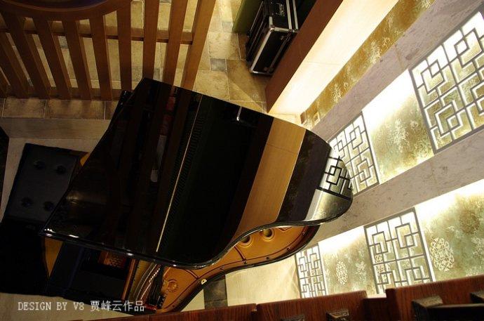 玄關后面是放置一架三角鋼琴的小中庭,中庭的背景采用爵士白石材與東方圖案木格加上中性光帶,與音樂具有了同樣的韻律。