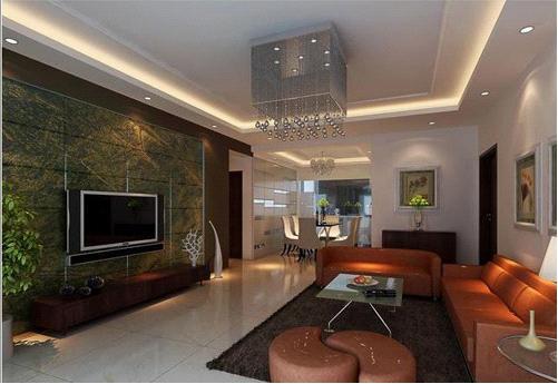 客廳作為家裝的重頭戲,必須慎重對待。在對比了若干不同效果的方案后最終確定了出了現(xiàn)在這個方案。由于該戶型客廳空間較大所以選擇做了個石膏板環(huán)形吊頂,