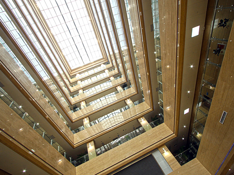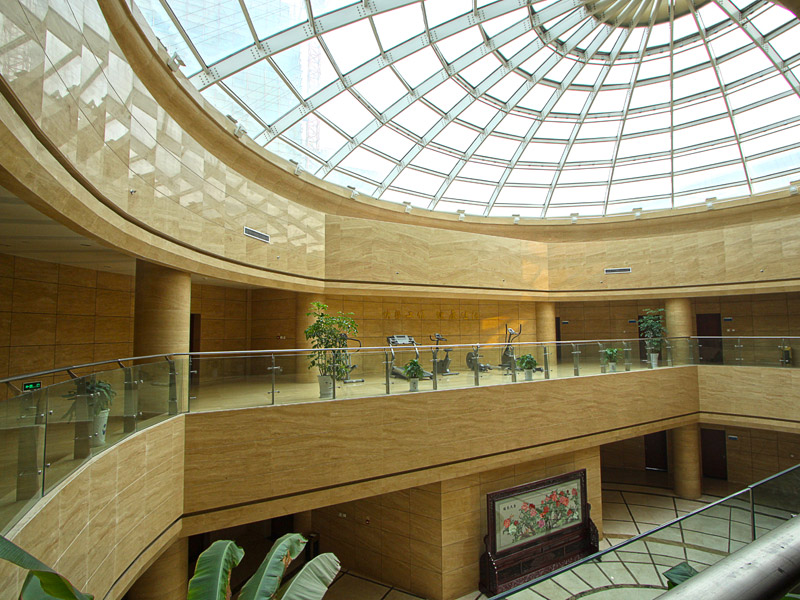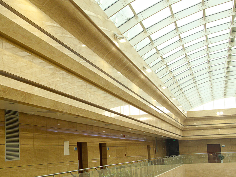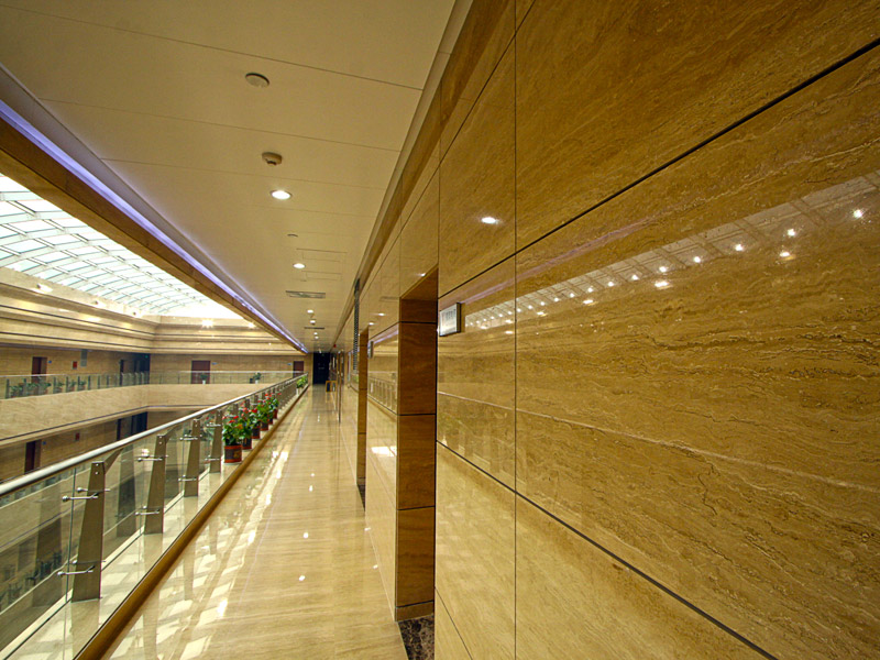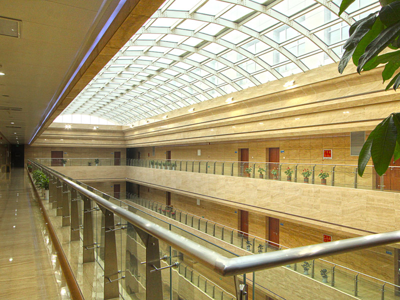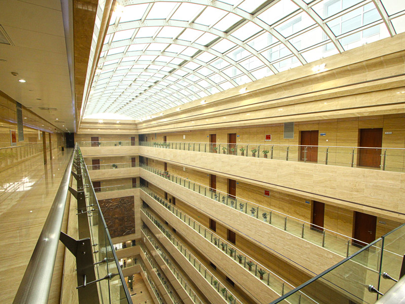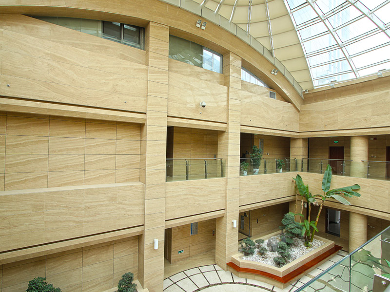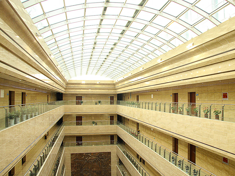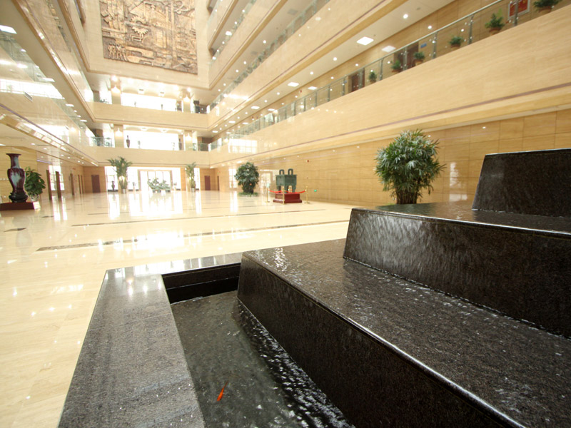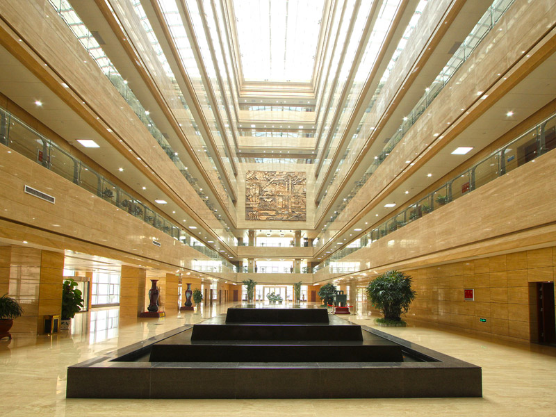 辦公大樓體量恢宏、風格嚴整,大氣磅礴而不乏工業質感和細部,較為完整地反映了能源產業和電力企業應有的特質。大樓內部和外部采用天然石材作為材料。 建筑坐落在鄭州開發新區,似有中原能源產業燈塔和風向標的意味,因此,在辦公室內設計案中我們可以強調這一點,在中廳生態水景中的多組探射燈組成的光柱穿過中廳空間,穿過玻璃采光頂直八蒼穹,一則象征電力資源的充足和行業特點,二則形成城市新的地標性如燈塔一般給人以方位感,也以光效形式的獨特效果來改變和突破原有的城市輪際線。