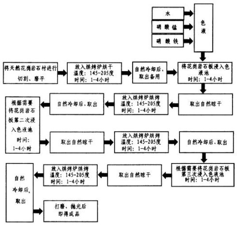 天然花崗石染色是一種將天然灰白色花崗石染成所需顏色,在建筑業上代替有色石材的新技術。本發明采用了由硝酸、鹽酸、鐵粉、氫氧化鈉、過氧化氫、銅粉等混合而成的滲透顏料,將其涂在被染的天然灰白色花崗石材上,經染色加溫工藝,即可染成內外顏色一致的有色石材。