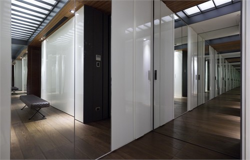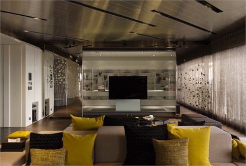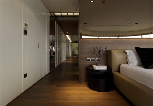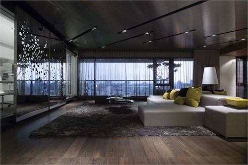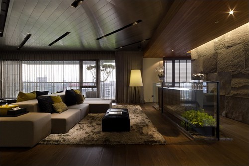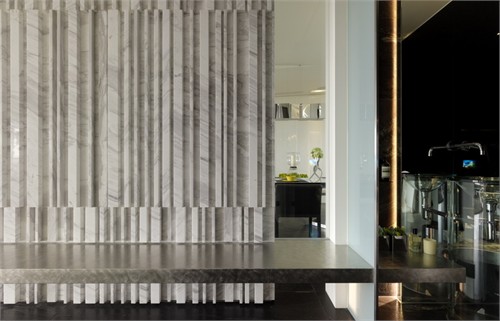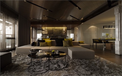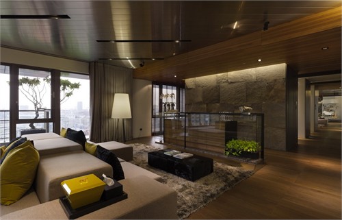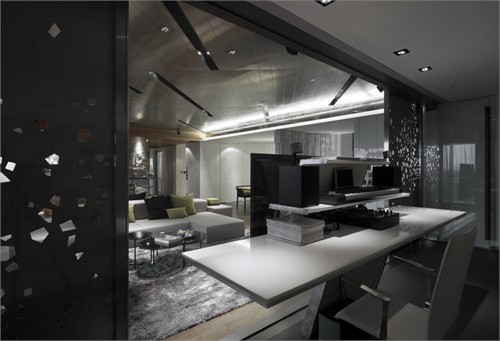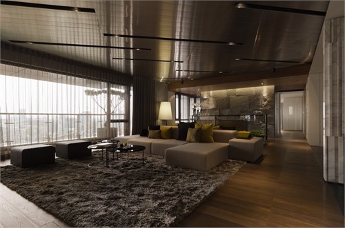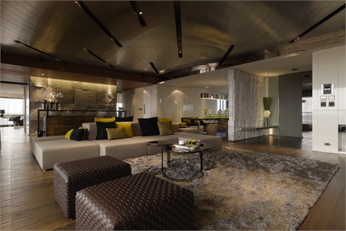 空間由一個自由平面展開,一道清晰的軸線貫穿主要空間。客廳沙發的配置決定了整個調性,是愉快的面貌,一面面對電視主墻,一面面對長形吧臺……以客廳沙發為空間重心,連結所有開放空間,空間之中,兩道主題:鏡面白鐵與原始石皮,冷峻天花與溫潤地板。