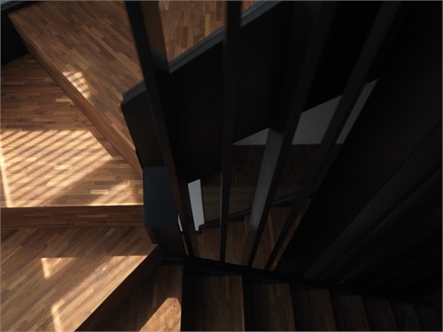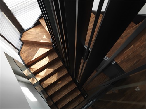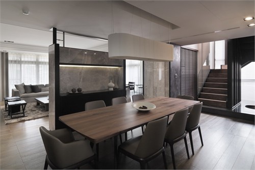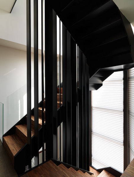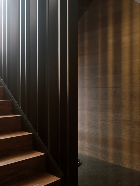 順應著樓梯與建筑開窗,重覆有序的垂直元素,利用突破尺度限制的格柵設計,變化陣列;調節自然的光線,可以從不同的面向穿透室內。