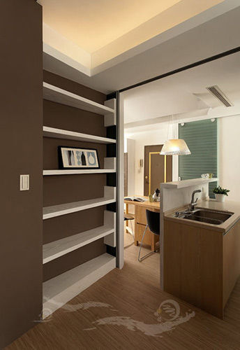 在廚房旁邊的玄關處裝飾著一個置物架,這里不僅可擺放藝術品,書籍同樣可收納其中哦!