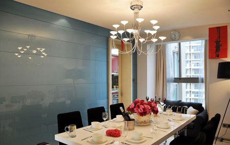 餐廳的軟裝配飾很浪漫,餐桌上餐具齊全,在家就能開party。