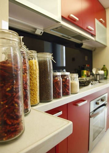 廚房性感簡約,紅色的櫥柜裝修質感十足,大理石的臺面更顯沉穩。