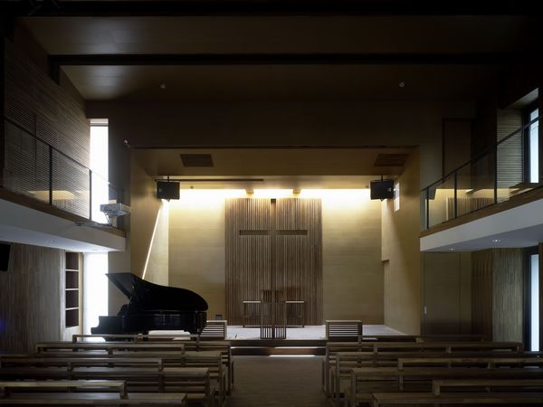 項目設計的原初構想來自于挪亞方舟,于是主要量體的一至四層形成一厚實如巖石的基座,來表達山的意象,而位于頂層的主堂體量則對應為山頂上的方舟。