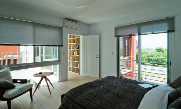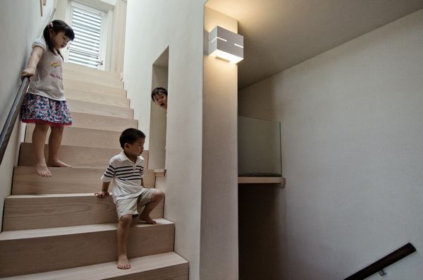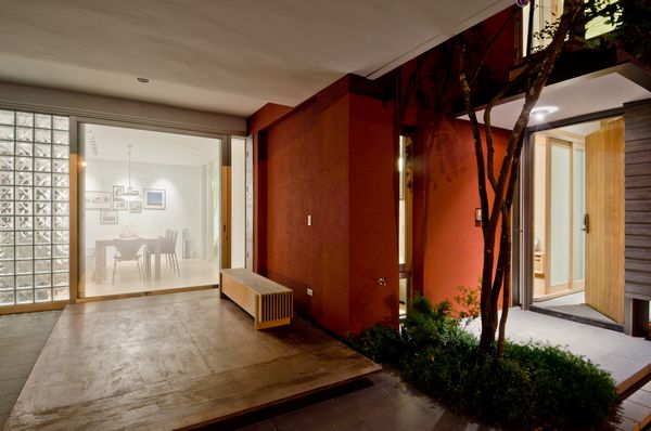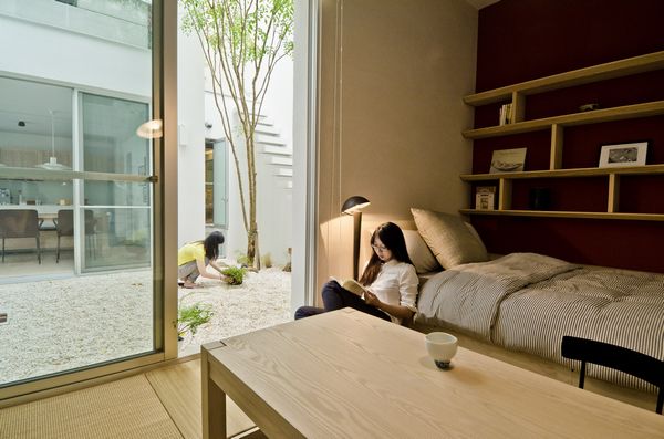 單元品字形的平面圍塑出一個內庭,讓生活空間從地面透到天上。內庭不但是一樓家庭起居生活的彈性延伸,也是一種使住宅能更貼近土地的重要媒介。