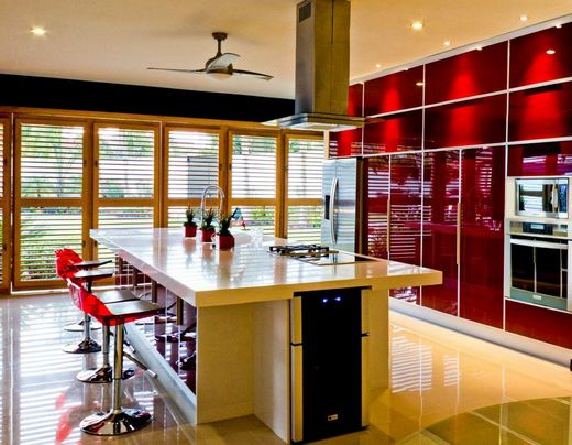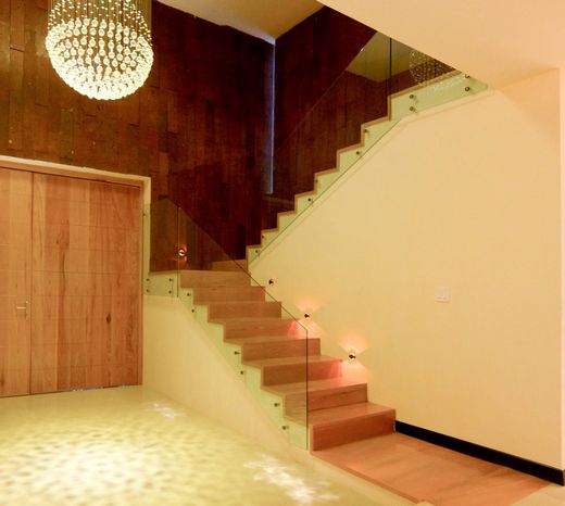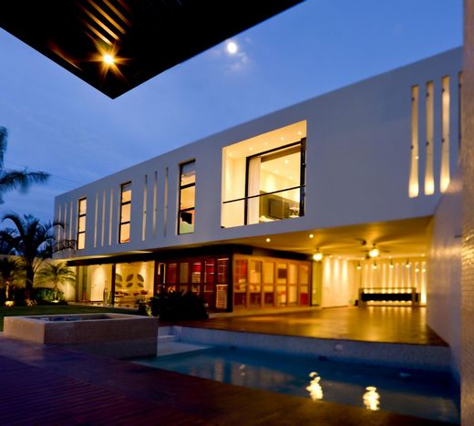 該項目是由R79設計的。這座房子寬26英尺進深43米。進入這座房子首先看到的是公共空間,私人空間上層,廚房在西邊,幾節踏步連接公共空間和廚房,外面直接延伸到游泳池和露臺。樓上是孩子的三個臥室和一個主臥室。該住宅的設計強調了線性度和空間的連續性,同時也有效的設計了燈光和聲音效果。