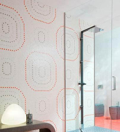 設計師建議:因為從墻面到地上,都選用了紅與藍相間的馬賽克背景墻圖案,因此此間的衛浴產品需要選擇純色系的以免空間中圖案以及顏色過多,而造成視覺混亂感。