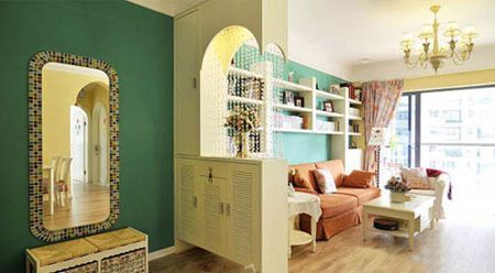 從這個(gè)角度可以看到客廳的全貌展示,玄關(guān)處的鏡子裝飾的很別致,精美的馬賽克墻磚,藤藝的收納筐,玄關(guān)柜用珠簾隔斷,隨風(fēng)靈動(dòng)。