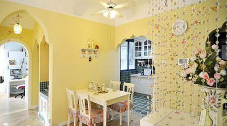 開(kāi)放式的餐廳節(jié)約了很大的空間,連接了廚房和客廳的視線(xiàn),背景墻刷成溫馨的淡黃色,感覺(jué)很幸福。