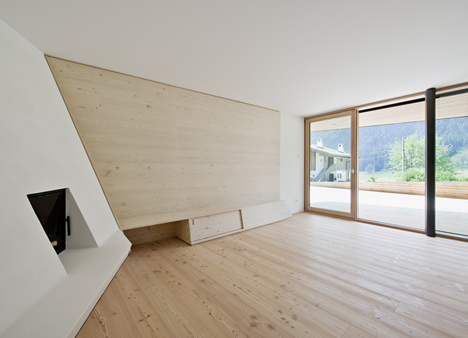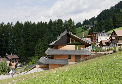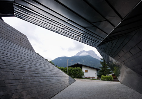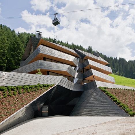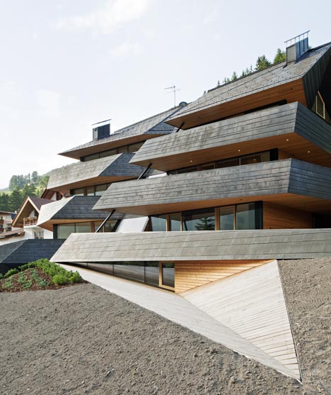 這座度假公寓位于意大利的東北部,由Plasma Studio設(shè)計事務(wù)所設(shè)計。鋸齒狀的銅質(zhì)表皮陽臺模仿了周圍景觀中的地形,中間凹進去一部分,周圍陽臺則向中間聚攏。位于意大利北部的白云石山脈,這座三層高的度假公寓內(nèi)包括六套度假住宅,全部面向東北方的山脈。一個對角線形狀的凹口成為了外立面的中心,將不同公寓的陽臺分開,并且讓建筑的尺度感更小。Plasma Studio的設(shè)計師解釋說:“這個凹口變成了建筑最主要的特征,拗口兩側(cè)連續(xù)的帶型構(gòu)件向兩邊延伸,形成了開闊的陽臺,盡端融入了周圍的地形中。
