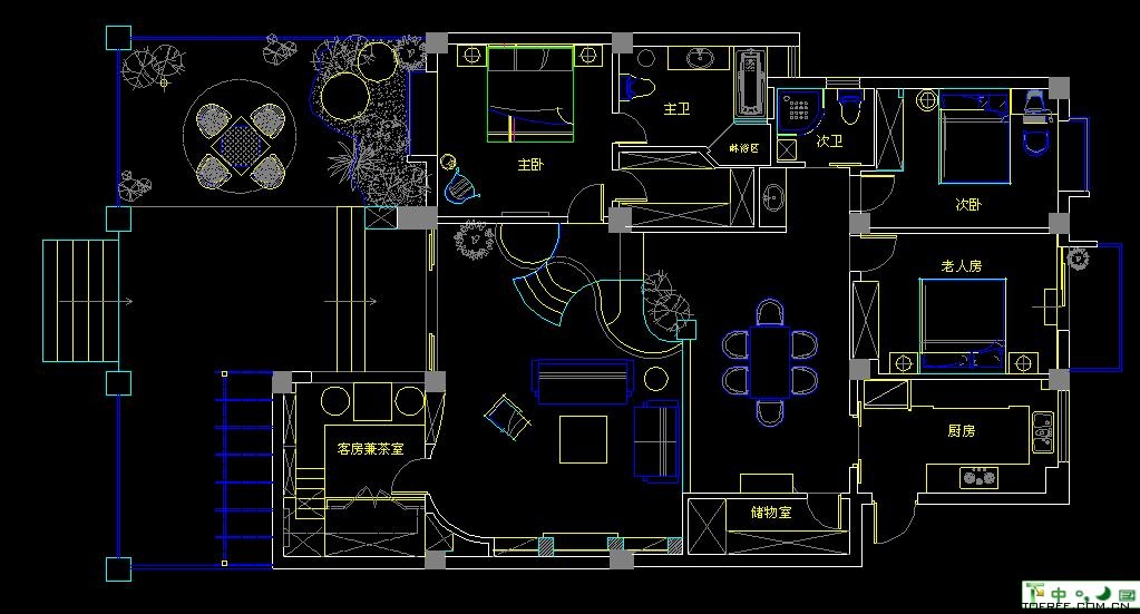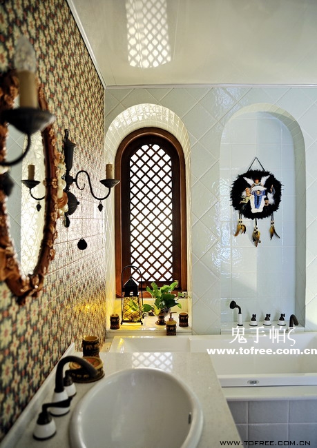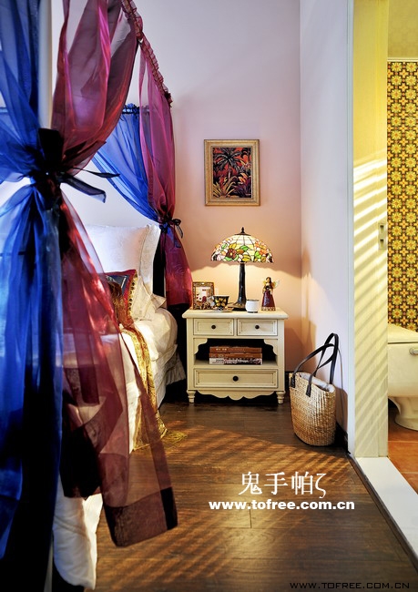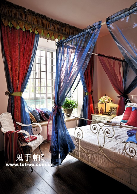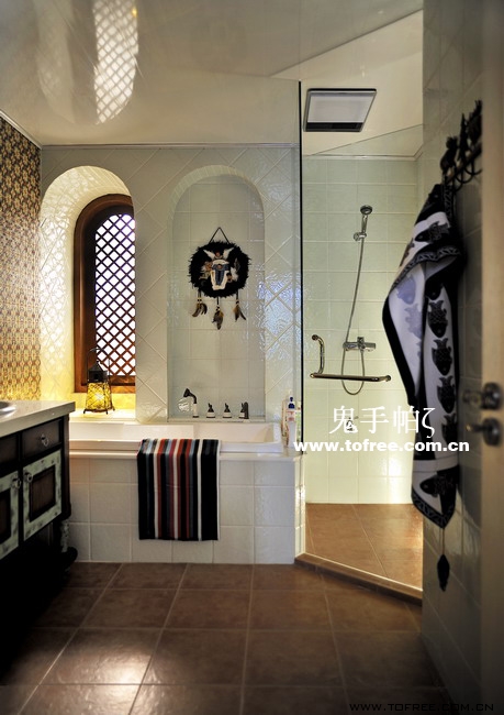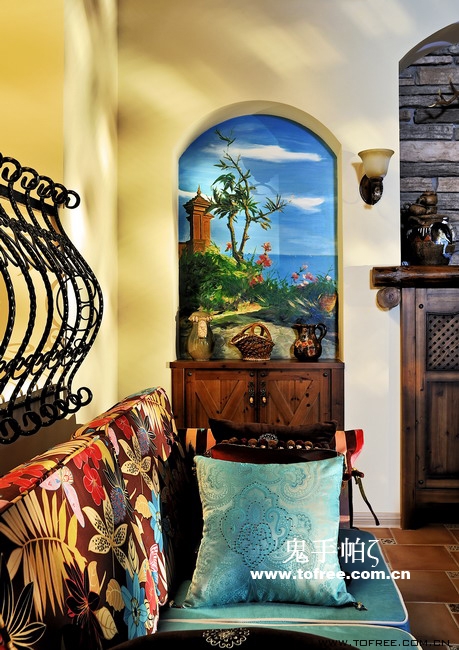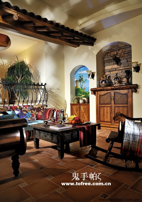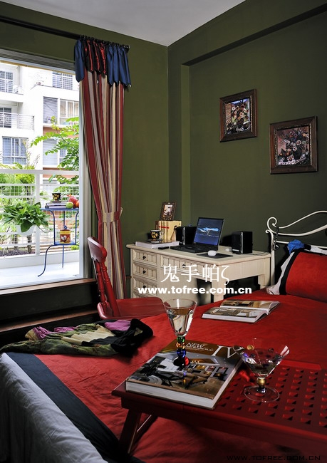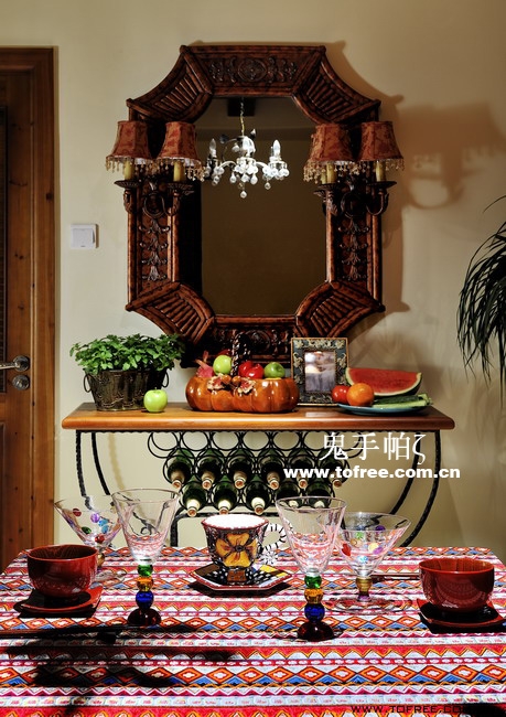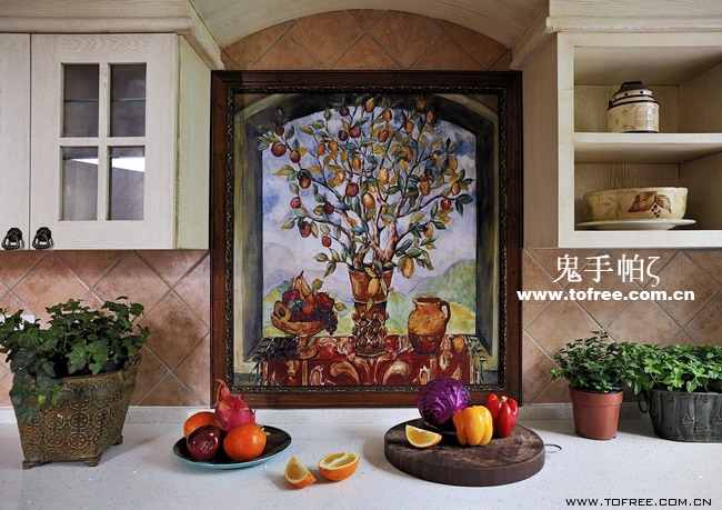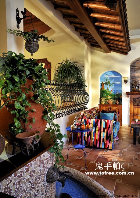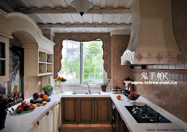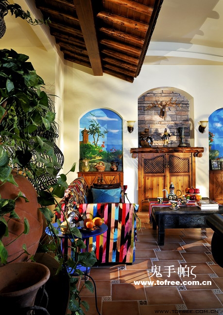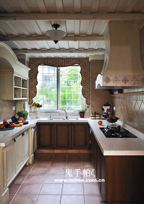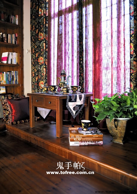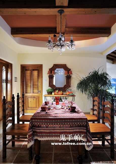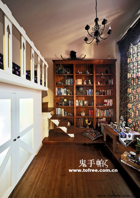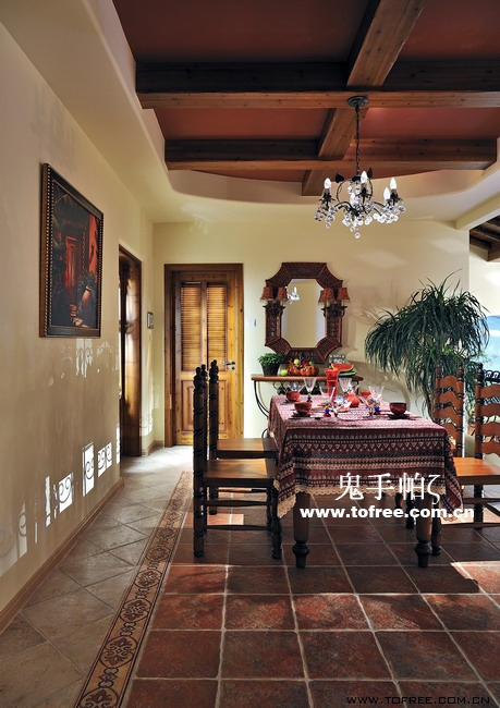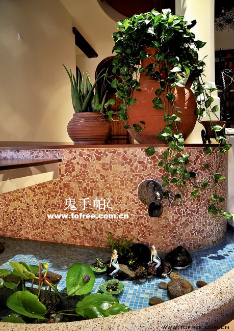 客廳和餐廳的落差形成空間的大氣,上幾級臺階樓梯從私家花園再步入客廳,也讓人有進入別墅的錯覺,客廳唯一不足的是有根50厘米的大梁穿過,而且梁不在錯層的地方,而是跨過1米,在沙發區頂上,也就是現在圖中屋檐頂上空水泥漆的地方,如何消除梁的破壞讓我很發愁,如果打算按梁來劃分區域客廳太過狹長,如果封平又太壓抑,如何保留原建筑的氣勢,我想到用屋檐掩飾大梁,內部再加些小梁來豐富視覺,餐廳頂用暗紅色,削弱屋檐暗色的孤立,但屋檐的引入客廳就要往庭院式靠攏了,于是挖地準備做魚池,正好景觀也縮短客廳太長的尷尬,而且進主臥可以利用平臺區,原戶型的樓梯是在電視墻那邊上去,從餐廳進主臥浪費走道空間,樓梯改位后可以保留出完整的更衣室,而且餐廳盡頭多余的部分也被劃為儲物室,經過改造客廳和餐廳連為一體,視覺延伸,互相借景。原戶型的大門是在廚房那邊,業主希望有個美麗的廚房讓她樂意呆在里面,于是我把大門直接劃進廚房,節約出玄關區擴大廚房面積,把去花園的后面當成入戶門使用,偶爾有買油膩的食物直接進廚房不要客廳餐廳繞過一大圈。