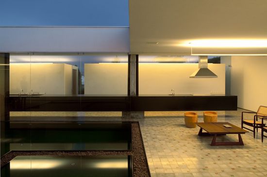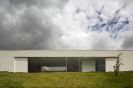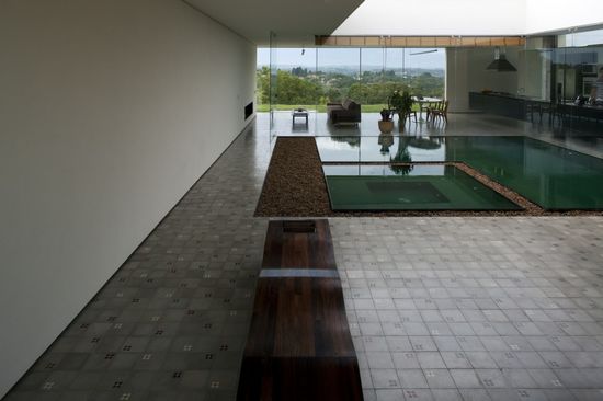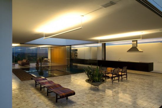 Sao Roque住宅以兩個約束條件為基礎:它充分利用南部平均20%的坡度,建成一個單層的住宅。院子、地板和水都應該位于相同的水平面。該結構以間隔12米的兩大支柱為基礎,在中心支撐著一個90厘米高的梁,然后向兩端逐漸減少的20厘米高,其每個4米長的懸臂都超出了支柱。