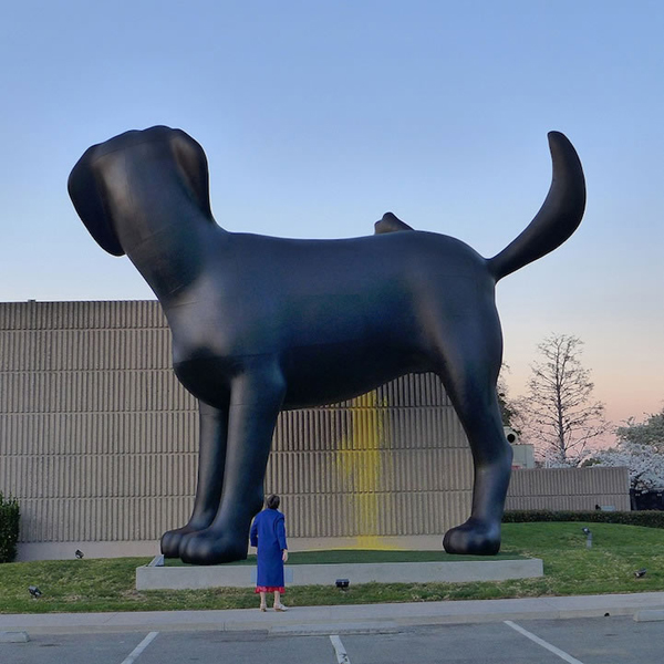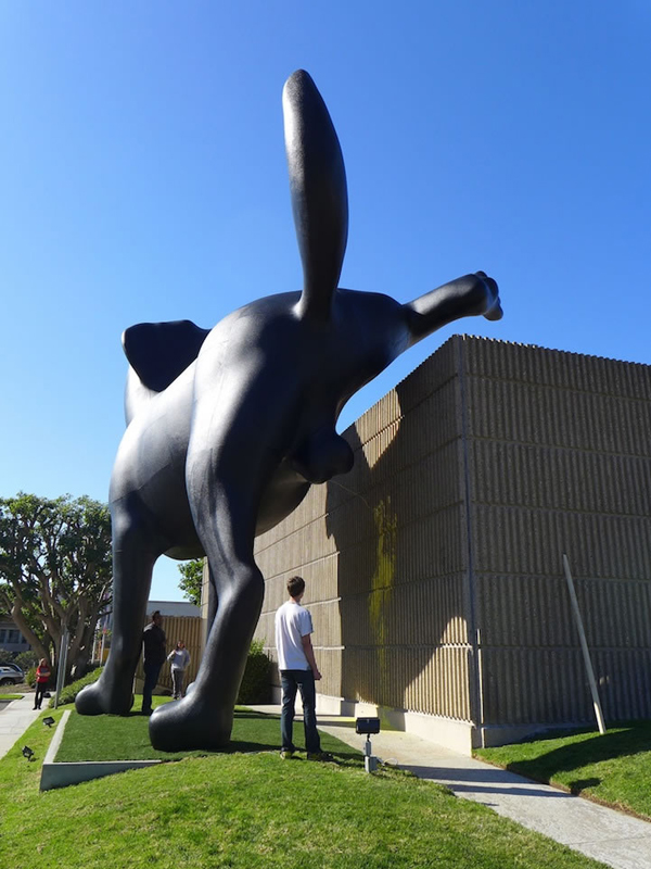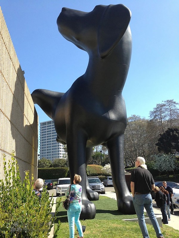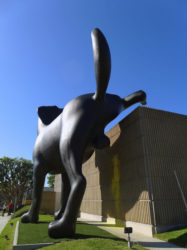 近日,依傍在美國加利福尼亞州紐波特海灘邊上的奧蘭治縣藝術館(OCMA)館外新添了一座充滿趣味性的雕塑,該雕塑是一只高達28英尺(約8.5米)的拉布拉多獵犬,而有趣的地方是描述該獵犬在尿尿。該雕塑作品由74歲高齡的戶外藝術老藝術家Richard Jackson創作。該作品主要穿搭與小狗尿尿劃地盤同理的一種領地意識。另外該雕塑還是模仿尿尿,會噴射出有顏色的油漆,根據不同時間噴射不同的顏色。