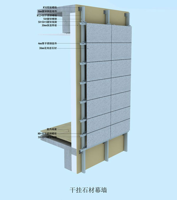 外墻干掛石材幕墻以其獨特的自然莊重、色彩絢麗風格與外形而備受推崇,它既有效防止常規飾面石材濕貼法施工引起的石材墻面泛堿、變色、空鼓、脫落等缺陷,又具有縮短施工周期、安裝精度高、裝飾效果好、減輕建筑物自重、提高抗震性能等優點,特別是具有安裝牢固、使用安全的特點,在建筑室外墻面的裝飾中得到了廣泛應用,受到業主和建筑師的青睞。