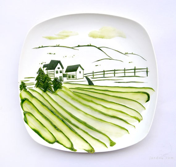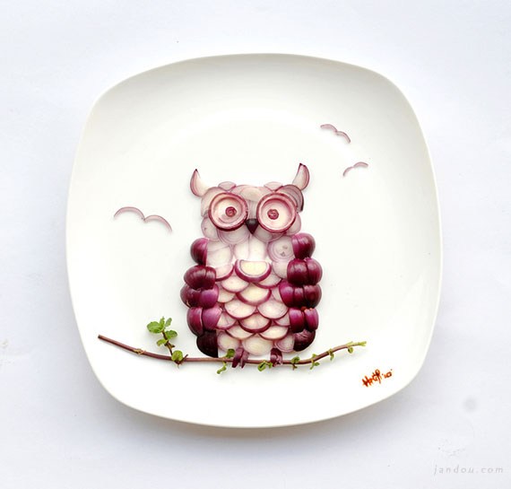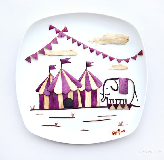 在餐盤的局限中利用各種食材創(chuàng)作出一系列風(fēng)景、動物等景觀,以此來促進(jìn)自己的創(chuàng)作靈感。