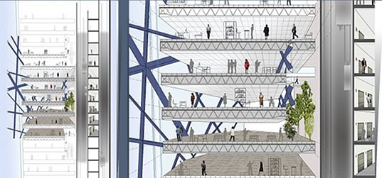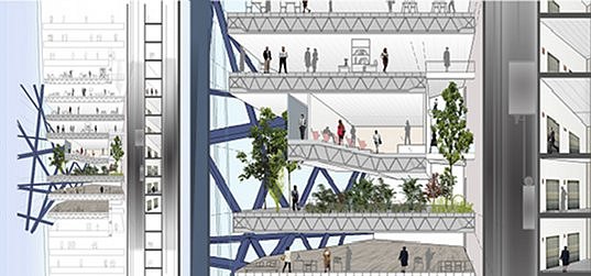 在摩天大樓的中心還有雙層公園,供大樓的居住者和公司員工放松。