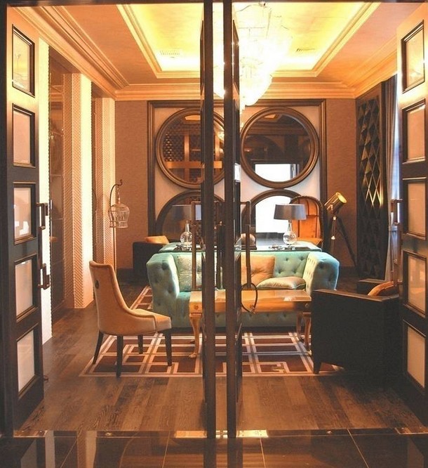 整個(gè)設(shè)計(jì)空間環(huán)境以黑白為主調(diào),顯得莊重典雅。藝術(shù)品及家具陳設(shè)色彩紛呈,宣泄個(gè)性。奢華的觸感質(zhì)地及高光材質(zhì)使懷舊的煙熏色得到升華。酒店公共部分的設(shè)計(jì)通過顏色的反差和藝術(shù)品的烘托來營造一種剛?cè)嵯酀?jì)的中性感覺。整個(gè)顏色的調(diào)子是在懷舊的色彩中彰顯出沉穩(wěn)與大氣,而如同繁星一般的水晶燈點(diǎn)綴其中,給環(huán)境增添了幾分靈動(dòng)。