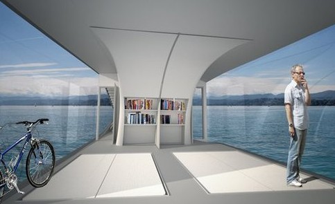 在可移動式太陽能水上漂浮住房里可擺放書架,自行車等