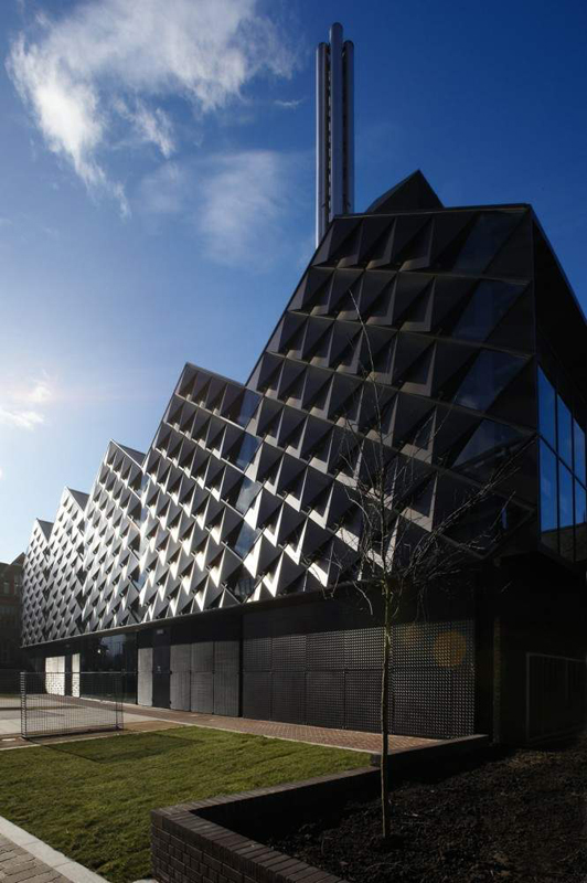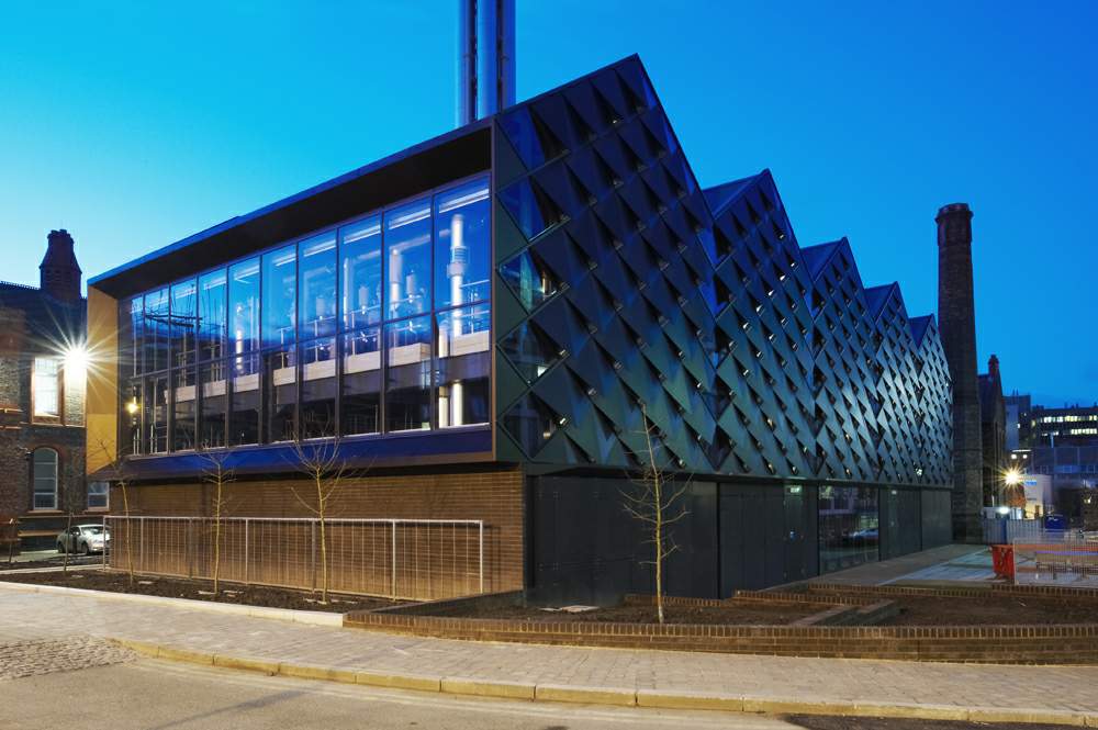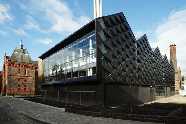 英國利物浦大學(xué)新能源中心,提供了挑戰(zhàn)在突出位置建立一個鍋爐房的一個新穎的回應(yīng)。它位于大學(xué)于2008年落成的萊維特伯恩斯坦的第一所樓宇的幾個院落中。新大樓位于校園內(nèi)的主要行人脊柱上,在一個有吸引力的維多利亞時代的建筑區(qū)域內(nèi)。新能源中心,包括400萬伏安天然氣驅(qū)動的熱電聯(lián)產(chǎn)裝置,3 × 12Mw鍋爐組成和3.4Mw天然氣發(fā)動機。
