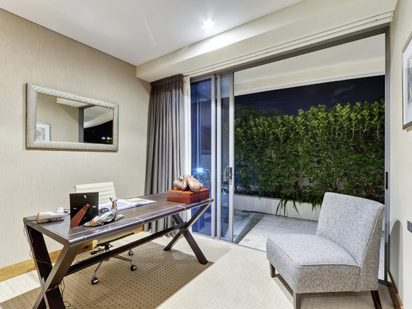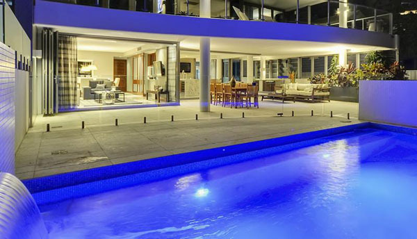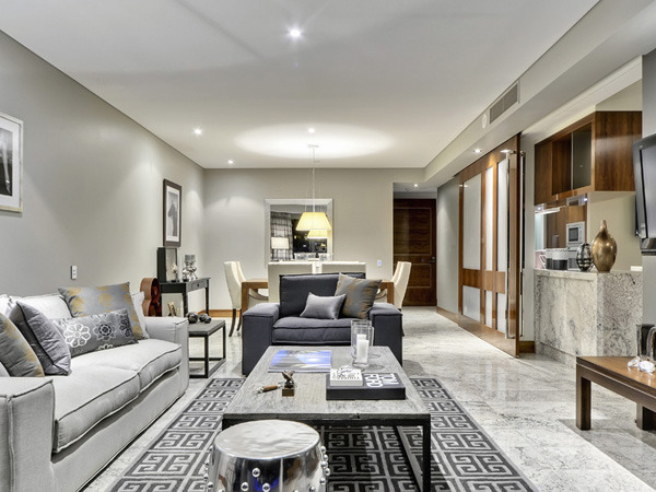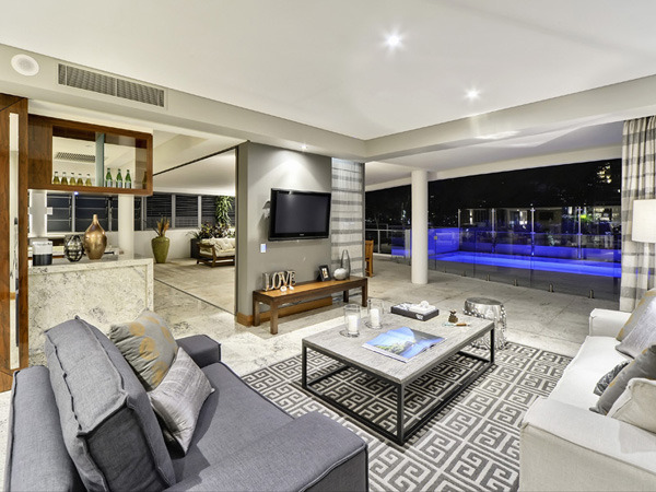 這套別墅擁有一個(gè)令人羨慕的大型游泳池,設(shè)計(jì)師在在裝修上花了很多心思。整體用不同深度的灰色勾勒出冷酷高雅的格調(diào),在面向游泳池的客廳、餐廳、廚房、休息區(qū),一律鋪上大理石瓷磚,炫目的反光效果和天然質(zhì)感打造出具有現(xiàn)代感的時(shí)尚空間。